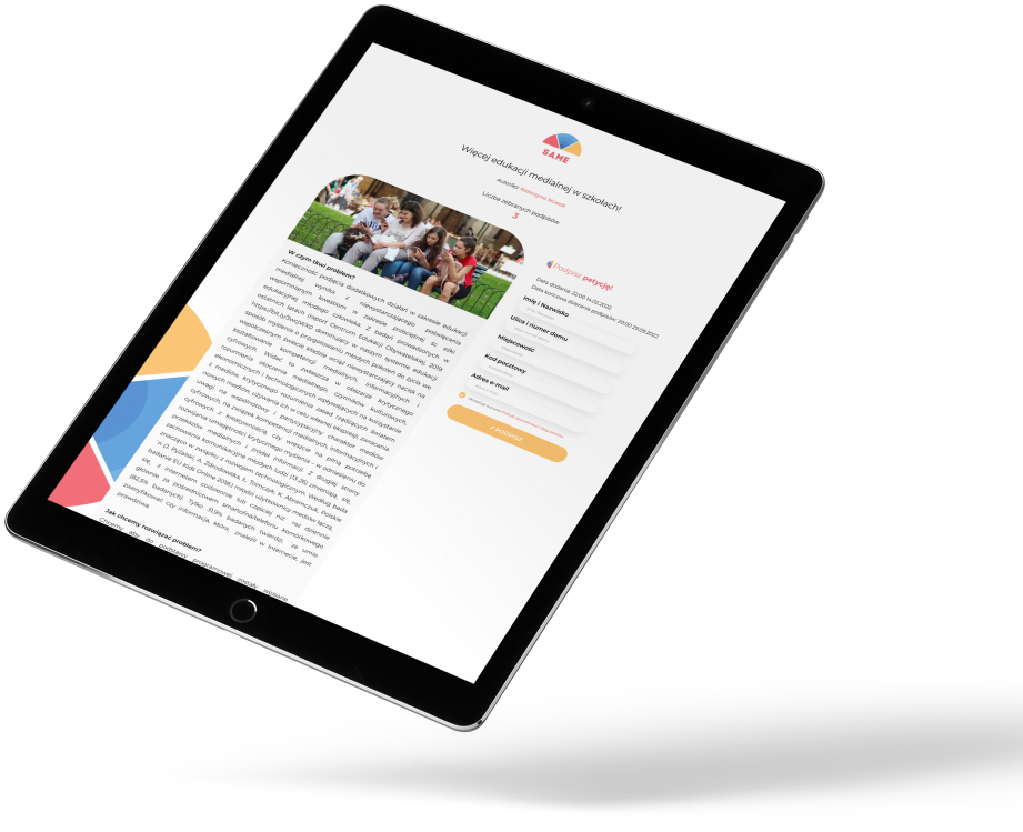 SAME Petycje to bezpłatne narzędzie stworzone przez Stowarzyszenie Analityków Mediów Elektronicznych, które umożliwia publikowanie własnych petycji i zbieranie pod nimi podpisów online! Z nami możesz zapoczątkować zmianę na szczeblu lokalnym, krajowym czy globalnym. Zabierz głos w ważnej dla Ciebie sprawie i otrzymaj wsparcie dla swojej inicjatywy od innych osób!